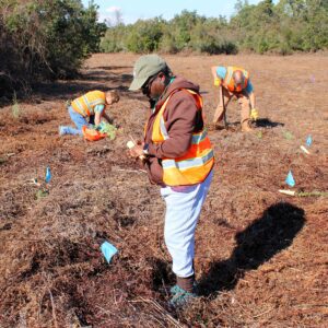 Atlantic white cedar (Chamaecyparis thyoides) is a conifer native to the coastal plain from Maine to Florida and west to Mississippi, thriving in freshwater swamps such as pocosins, bogs, and stream margins. Extensive logging in the 1800s and 1900s, coupled with wetland drainage and reduced fire, has prevented these forests from recovering in North Carolina. Their decline threatens wildlife uniquely dependent on them, including the Hessel’s hairstreak butterfly and yellow-throated warbler, while also diminishing important ecosystem services like water filtration and carbon sequestration.To restore this globally threatened habitat, NCWF has partnered with Pocosin Lakes National Wildlife Refuge to plant tens of thousands of Atlantic white cedar seedlings. In 2024, funding supported the planting of more than 14,000 seedlings across the Millennium Forest and Pungo Unit, followed by an additional 30,600 planted later that year with support from Apex Clean Energy. On November 22, volunteers – including former refuge managers—hand-planted 350 seedlings grown by Mellow Marsh Farm, celebrating a shared commitment to long-term conservation.Looking forward, restoration efforts face challenges from heavy deer browsing, which threatens young cedar survival. To address this, seedlings grown by the NC Forest Service were treated with the deer repellent Trico Pro, and NCWF and USFWS will monitor treated and untreated seedlings to evaluate effectiveness. The results will help guide future large-scale tree-planting projects across eastern North Carolina.