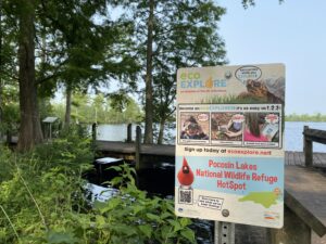Boardwalk and pollinator pitstop behind the refuge visitor center provides opportunities for wildlife observation in the heart of Columbia. The refuge is an ecoEXPLORE HotSpot, meaning that photo observations taken on the refuge count for extra points, and Tyrrell County Library serves as both a HotSpot and LoanSpot. LoanSpots are places, like libraries, where participants can check out observation tools, such as a trail camera or insect net, to assist with fulfilling a badge season’s requirements.