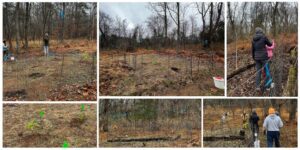 December 6, TCC Brumley Workday: NCWF Tri-County Conservationists Chapter held a native plant oases workday at Brumley Preserve in Chapel Hill. Volunteers planted over 45 native tree saplings and removed invasive plants around the oases. Volunteers also helped shore up the fencing around the oases to discourage deer from hopping in.