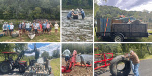 September 6, Mountain Island Cleanup. New River Conservancy, Keep Alleghany Litter Free, NC State Parks, New River Wildlife Conservation Club, and NCWF’s High Country Wild joined forces for an unforgettable experience on the New River in Alleghany County. The volunteer crew removed 3200 lbs of trash and debris in an effort to keep our waterways clean and maintain suitable habitat for the abundance of both terrestrial and aquatic wildlife that rely on the New River.