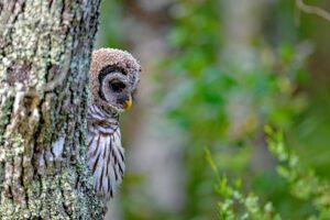 Barred owls are often easier to hear than to see. They are often called “eight-hooters”, due to their recognizable series of eight hoots often described as “Who cooks for you? Who cooks for you all?” By following the sound and carefully scanning tree trunks and branches, you may eventually spot one quietly perched and blending into the forest.