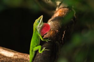 Green anoles are easiest to spot while basking on fences, tree trunks, and shrubs. During the breeding season – generally from April through September – males become even easier to notice. Male green anoles display a bright pink or red throat fan called a dewlap, which they extend to establish territory, warn rivals, and attract mates.