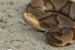 Because of this camouflage, copperheads are often only noticed when they move. When walking in wooded areas, it’s helpful to watch the ground ahead and look for the distinctive hourglass pattern among the leaves.