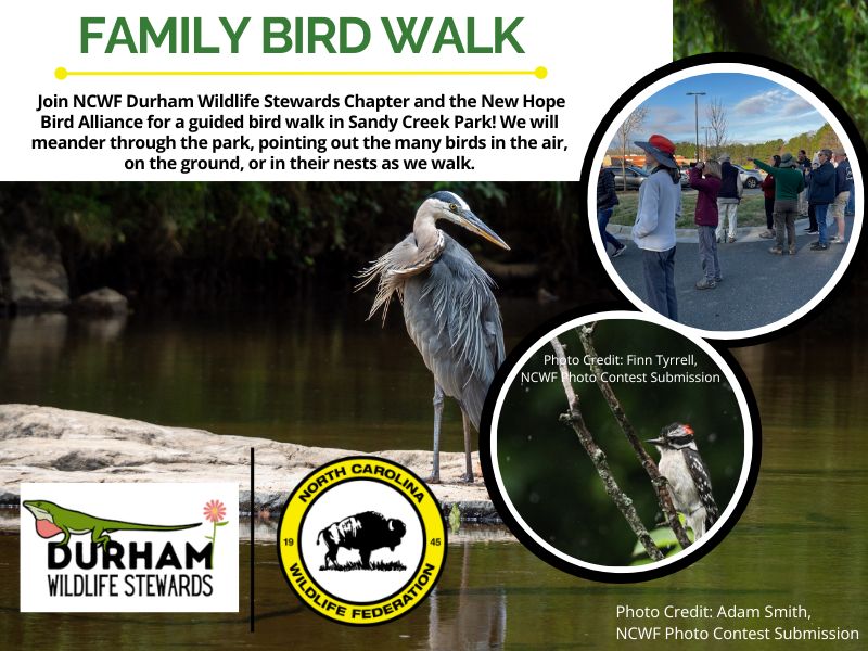 Join NCWF Durham Wildlife Stewards Chapter and the New Hope Bird Alliance for a guided bird walk in Sandy Creek Park. We will meander through the park, pointing out the many birds in the air, on the ground, or in their nests as we walk. This is mating and nesting season, and birdsong will be…