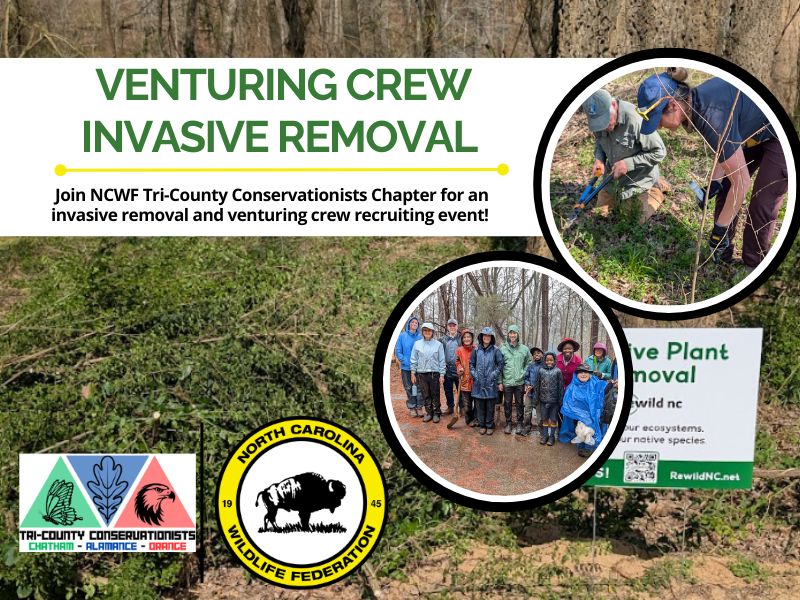 Calling all teens! Join NCWF Tri-County Conservationists Chapter and RewildNC for an invasive removal and venturing crew recruiting event. The Tri-County Conservationists are launching a new program to engage conservation-minded youth ages 14-20 in partnership with Scouting America. Interested youth will come together to plan conservation events, like invasive removals, under the name Venturing Crew3.… |