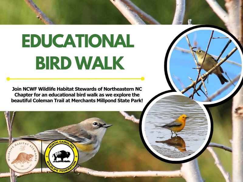 FeaturedJoin NCWF Wildlife Habitat Stewards of Northeastern NC Chapter for an educational Bird Walk! Come explore the beautiful Coleman Trail at Merchants Millpond State Park on Saturday, February 21, from…