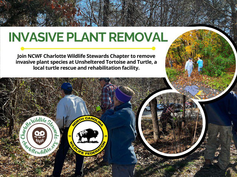 Join NCWF Charlotte Wildlife Stewards Chapter and community volunteers to remove invasive species at Unsheltered Tortoise and Turtle, a local rescue and rehabilitation facility. Invasive plants are non-native introduced plants that do not support native wildlife. They are aggressive, outcompete wildlife-friendly plants, and take over natural areas. Removing invasive species is often the first step… |