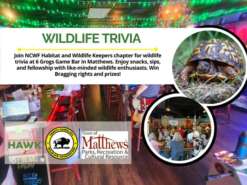 Join us for Wildlife Trivia at 6 Grogs Game Bar in Matthews! Enjoy free snacks while you sip a frosty beverage and test your knowledge against other Nature Nerds! Win prizes and, more importantly, BRAGGING RIGHTS! Learn about the wildlife all around us while having fun with like-minded folks! Proceeds from the evening support the… |