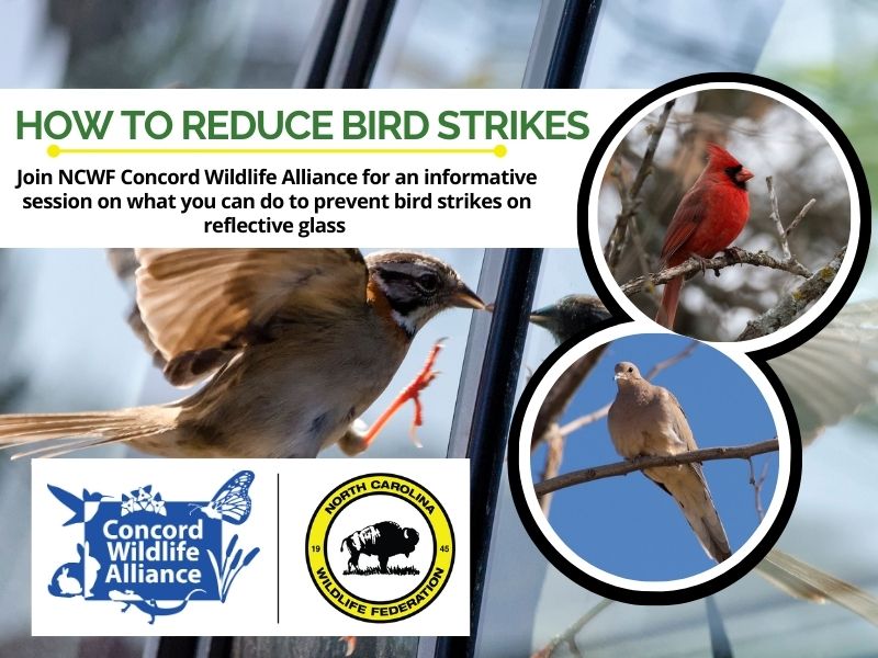 Did you know that bird strikes on reflective glass is the second leading cause of mortality for songbirds - right behind feral cats! Join NCWF Concord Wildlife Alliance Chapter as we welcome Tracy LeCompte from Cooperative Extension to learn more about the actions you can take and the role you can serve to help educate…
