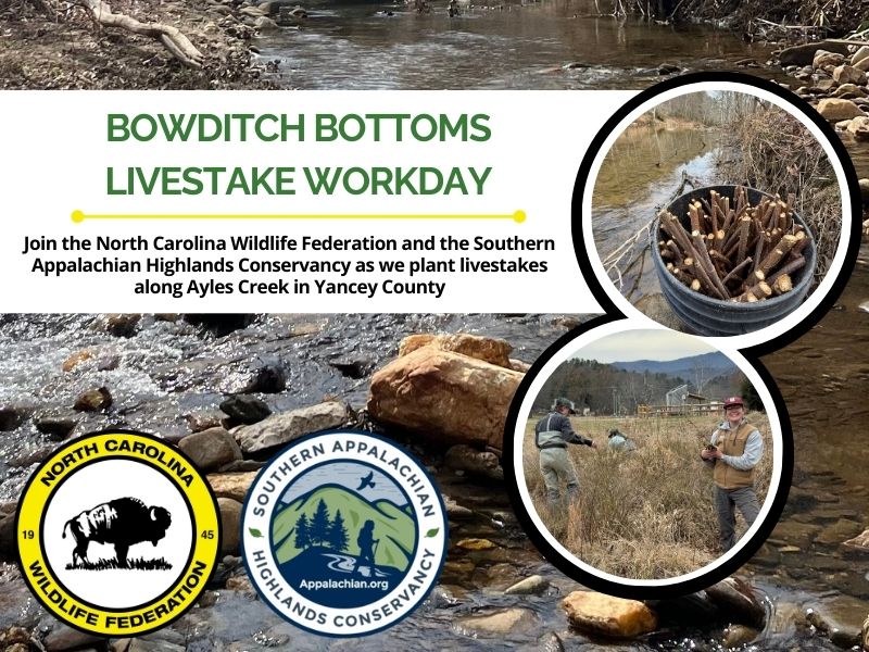 Join the North Carolina Wildlife Federation and the Southern Appalachian Highlands Conservancy for a livestaking workday at Bowditch Bottoms in Yancey County. Bowditch Bottoms contains a mosaic of habitat types including mixed hardwood forest, open field, natural wetland, and a riparian area that buffers over a half mile of Ayles Creek within the South Toe…