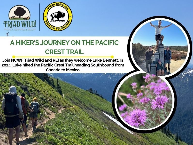 Join NCWF Triad Wild! Chapter and REI as they welcome NCWF Conservation Coordinator, Luke Bennett. In 2024, Luke decided to run away from responsibilities and thru-hike the 2,650 mile Pacific Crest Trail heading Southbound from Canada to Mexico. Along the way he experienced stunning landscapes, close encounters with wildlife (including a near death experience with… |