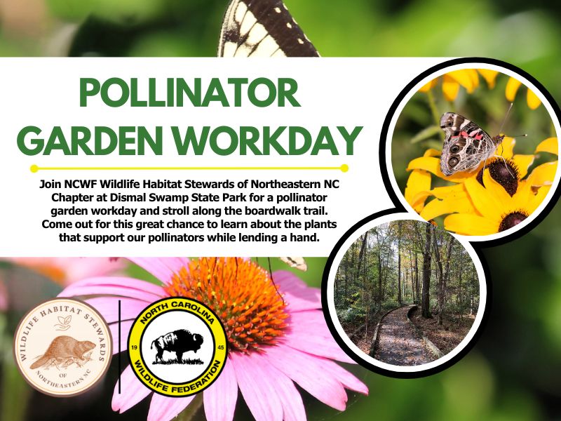 Join NCWF’s Wildlife Habitat Stewards of Northeastern NC Chapter at Dismal Swamp State Park on Thursday, March 26 from 10 a.m. to noon as we get the pollinator garden ready for the season. Together we’ll tend to the garden, trimming grasses and shrubs, caring for the flowering perennials, pulling invasive weeds, and even installing a…